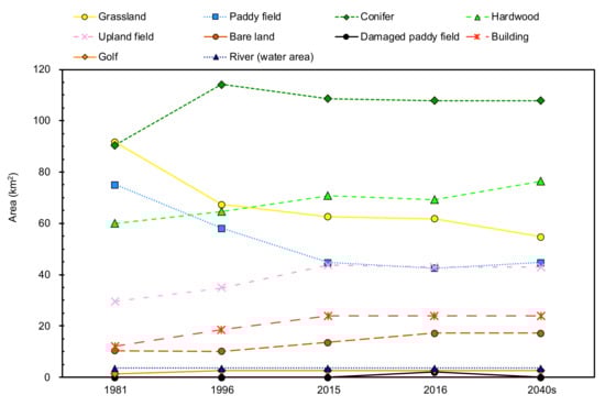 Figure 6 shows the secular change in area in each land cover category. The changes between 1981 and 2015 are significantly represented in the dominant land covers: grasslands, conifers, hardwoods, paddy fields, and upland fields. Grasslands, which occupied the largest area in 1981, significantly decreased from 91.6 km2 to 62.6 km2. The transformations around the central cones and northeastern part of the outer rim are notable (Figure 3a–c). The grasslands in Aso caldera are ‘semi-natural grasslands’ that have been maintained by preventing their transition to forests due to artificial disturbances such as open burning, grazing, and mowing []. Since 1965, the grassland area that lacks artificial disturbances due to a variety of factors, such as the aging of farmers, the lack of successors, changes and stagnation in the agriculture and livestock industry, and changes in lifestyle, has been increasing []. Under these social conditions, semi-natural grasslands in Aso caldera transition to forests []. Therefore, these results indicate that the increase in the hardwood area from 60.0 km2 to 70.7 km2 is due to the transition of grasslands. In addition, grasslands have been converted to planted forests, such as Japanese cedar and cypress [], increasing the area of conifers from 90.4 km2 to 108.6 km2. However, the conifers did not continue to increase until 2016 and decreased slightly between 1996 and 2015. It is probable that this decrease was caused by trimming, according to the satellite images. In 2016, a number of landslides due to the earthquake occurred on a hillside where forests and grasslands are distributed. The landslides that occurred near the confluence of two rivers (western part of Aso caldera) were the largest (Figure 3d). The affected area was about 200 m in width, 5–10 m in depth, and 325 m in height []. Because of the impacts of landslides, the areas of grasslands, conifers, and hardwoods were reduced by 0.8 km2, 0.7 km2, and 1.5 km2, respectively. As a result, the area of grasslands in 2016 decreased to 68% of that in 1981. There is an ongoing situation in which grasslands cannot be maintained, especially in Nangou-Dani, because of earthquake-induced damages such as road disconnection. According to the future prediction, the area of grasslands in 2016 could decrease by about 7.2 km2 by the 2040s, reaching 60% of the area in 1981. The transformation is remarkable in the western part of the outer rim in Nangou-Dani (Figure 3e).
