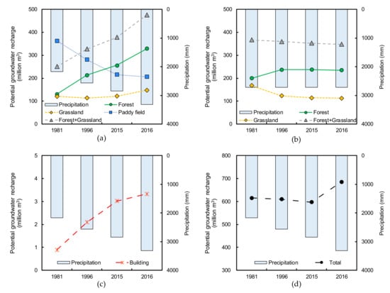 Temporal changes in potential groundwater recharge for Forest, Grassland, Paddy field, and Building: (a) actual precipitation, (b) constant precipitation, (c) actual precipitation, (d) actual precipitation.