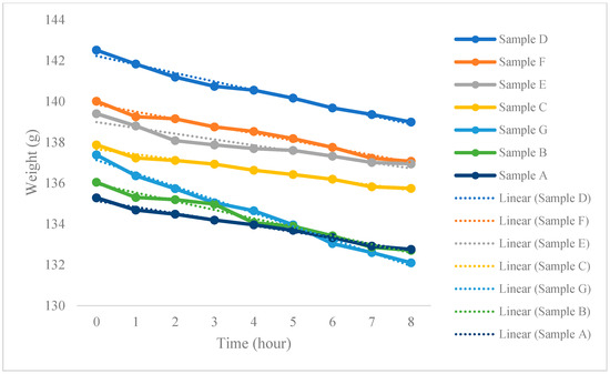 Water vapor transmission of different masks. Note: Water vapor transmission rate (slope): Sample D = −0.4182; Sample F = −0.3537; Sample E = −0.2833; Sample C = −0.2517; Sample G = −0.6477; Sample B = −0.421; Sample A = −0.3027.