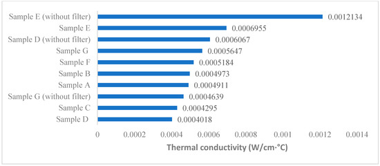 Heat transfer involves three main physical mechanisms, namely, radiation, convection and conduction [31]. In particular, thermal conduction is generally believed to be the most significant process for fibrous materials because it occurs when a temperature gradient is present between the material and the environment [31]. Radiation can be neglected when the temperature gradient is small. Similarly, convection can also be disregarded when the friction of the fibers is high because it will be suppressed by the pores. According to Figure 4, Sample E shows the highest thermal conductivity at 0.0006955 and 0.0012134 W/cm °C, regardless of whether a filter is used. Several cases have suggested that there is a positive correlation between air permeability and thermal conductivity, because the entrapped still air appears to provide significantly more insulation than the fibers and thus retains the heat in the in-mask atmosphere [29,32,33]. However, the test results of the masks appear to indicate little correlation between thermal conductivity and air resistance (R2 = 0.05), which could be because air permeability is not influenced by the material used for masks, whereas this is not true for thermal conductivity.
