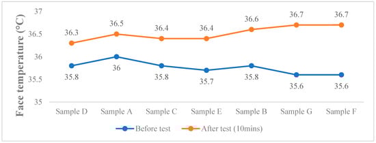 Figure 5 shows the results of the wear trial. With the lowest temperature difference of the face (0.5 °C), the lowest temperature inside the mask (32.5 °C), and relatively low humidity inside the mask (85.5%), Sample D appears to be the most comfortable mask to wear. On the contrary, Sample F appears to be the least comfortable, since it recorded the highest temperature difference of the face (1.1 °C), in addition to a relatively high temperature (34.2 °C) and level of humidity inside the mask (87%).