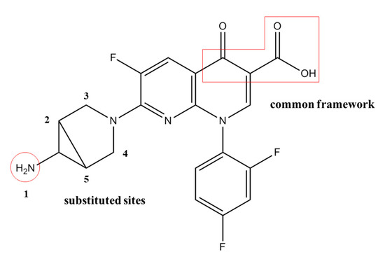 Logfb, the experimental value of the plasma protein binding rate of 16 quinolones, was used as the data source. Thirteen quinolones were randomly included in the training set, and the remaining 3 quinolones were included in the test set to establish the 3D-QSAR model. By using SYBYL-X2.0, the lowest-energy conformation of a molecule was selected as the dominant stable conformation, and the geometries of these compounds were subsequently optimized using the Tripos force field with Gasteiger–Hückel charges. Repeated minimizations were performed using the Powell method with the maximum number of iterations set to 10,000 to obtain an energy convergence gradient value of 0.005 kJ/mol [18,19]. The optimized molecules were stored in the database for alignment. By selecting the widely used trovafloxacin (TRO) as a template molecule, all molecules were aligned based on the pharmacophore characteristic elements as the common framework, as labelled in Figure 1. By using the CoMSIA module, a QSAR model suitable for predicting the plasma protein binding rate (logfb) of quinolones was established.