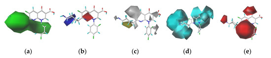 In this study, we selected trovafloxacin as the target molecule. In the contour maps generated using the CoMSIA model (Figure 2), the steric field represented by the green region is distributed near the 1-, 2-, 3-, 4-, and 5- substituents, indicating that the introduction of small groups at positions 1-, 2-, 3-, 4-, and 5- reduced the logfb values of the quinolones and reduced their binding rates to plasma protein. The electrostatic field represented by the blue region is distributed near position 5-, indicating that the introduction of electropositive groups at position 5- could reduce the logfb values of the quinolones. The white region representing the hydrophobic fields was distributed at the 1- substituent, indicating that the introduction of a hydrophobic group at position 1- could reduce the logfb values of the quinolones. The hydrogen bond donor field represented by the cyan region is distributed at positions 1- and 2-, indicating that the introduction of the hydrogen bond donor at positions 1- and 2- could reduce the logfb values of the quinolones. The red region representing hydrogen bond acceptors is distributed at the position 1- substituent, indicating that the introduction of the hydrogen bond acceptor at position 1- could reduce the logfb values of the quinolones.