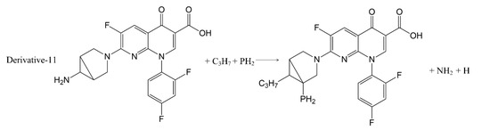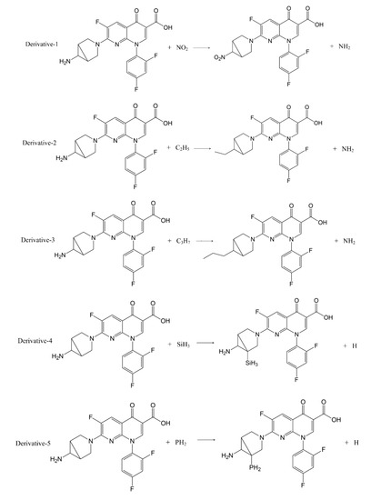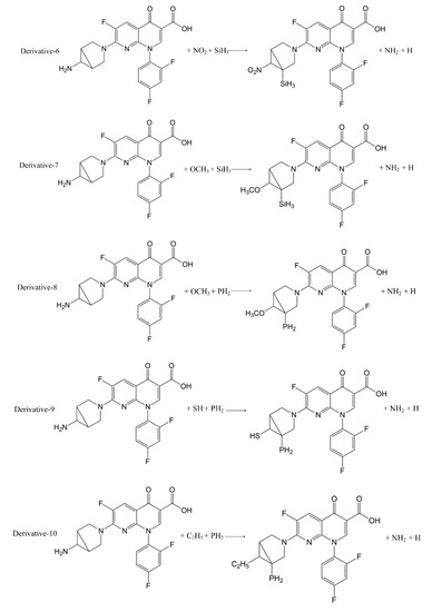 In addition to calculation of the positive frequency values of the TRO derivatives, the pathways of substitution reaction between the 7 substituents (-SH, -C2H5, -C3H7, -SiH3, -NO2, -PH2, -OCH3) and trovafloxacin were inferred (Figure 3). The Gibbs free energy change (ΔG) of the 11 substitution reactions were calculated using Formula (2) to judge the possibility of occurrence of the substitution reaction pathways [31,32] (Table 5).