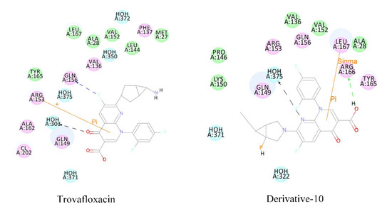 Energy simulation was performed for the complexes of trovafloxacin and derivative-10 with plasma protein (Figure 7).