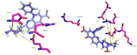 The bond lengths between the NH2 substituent at site 1 of trovafloxacin and the hydrophilic amino acid residues Gln149, Gln156, and Arg153 at the active site of the plasma protein were 5.9 Å, 7.6 Å, and 8.2 Å, respectively, and the average distance was 7.2 Å. The bond lengths between the C2H5 substituent at site 1 of derivative-10 and the hydrophilic amino acid residues Gln149, Gln156, Arg153, Arg166, and Lys150 at the active site of the plasma protein were 6.2 Å (>5.9 Å), 9.0 Å (>7.6Å), 12.1Å (>8.2 Å), 17.5 Å, and 6.1 Å, respectively, with an average distance of 10.2 Å. The binding rate and docking scoring function of trovafloxacin to plasma protein in Table 2 and Table 6 are higher than those of derivative-10. It was concluded that the further the average distance between the substituent of site 1- and the hydrophilic amino acid residue, the weaker is the hydrophilic effect between fluoroquinolone and plasma protein, and the smaller is the binding force between them. Therefore, the average distance between substituent 1- and the hydrophilic amino acid residue is negatively correlated with the binding force between fluoroquinolone and plasma protein, as well as with the plasma protein binding rate of fluoroquinolone.