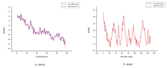 RMSD refers to the root mean square deviation of each atom between the protein conformation and its initial conformation. Each conformation has an RMSD value. The smaller the RMSD value is, the lighter is the motion amplitude of each atom in the protein and the higher is its stability [47]. Figure 6a shows that the RMSD trajectories of trovafloxacin and derivative-10 are essentially identical, which means that during molecular dynamics simulation, trovafloxacin and derivative-10 can be thought to have exhibited good stability. In addition, in the first 40 conformations, the motion trajectory showed a significant downward trend, and as a result, the trajectories of the complexes fluctuate greatly at this stage. When the simulation system reached the 40th conformation, the RMSD value of the entire system was low, and the fluctuation amplitude was small. As a result, all systems tended to be balanced at this time.