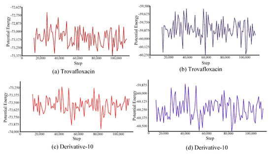 Because of the interaction force between molecules, energy is related to their relative positions, namely molecular potential energy and total energy [49]. The motion trajectory of potential energy (Figure 7a,c) showed that the potential energy of trovafloxacin varied between −73,375 kcal/mol and −72,625 kcal/mol, and its average potential energy was approximately −73,100 kcal/mol. However, the potential energy of derivative-10 ranged from −73,875 kcal/mol to −73,250 kcal/mol, and the average potential energy was approximately −73,500 kcal/mol. Therefore, the range of potential energy and average potential energy of the combination of derivative-10 and plasma protein were lower than those of trovafloxacin combined with plasma protein. This result indicates that the interaction between derivative-10 and plasma proteins was weaker.
