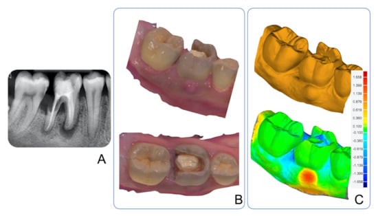 (A) Periapical radiograph of lower right posterior teeth demonstrating multiple periapical and radicular radiolucencies associated with endodontically treated tooth 46 and a mesial coronal radiolucency on tooth 47. (B) Intraoral scan of lower right posterior teeth demonstrating a dental abscess and failing restoration. (C) 3D-deviation analysis comparing intraoral scans pre and post abscess development.