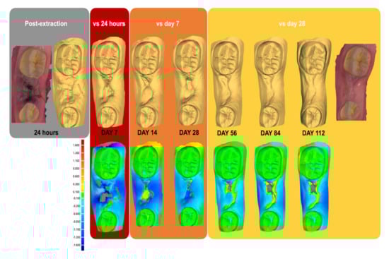 - Barone, A.; Toti, P.; Menchini-Fabris, G.B.; Derchi, G.; Marconcini, S.; Covani, U. Extra oral digital scanning and imaging superimposition for volume analysis of bone remodeling after tooth extraction with and without 2 types of particulate porcine mineral insertion: A randomized controlled trial. Clin. Implant Dent. Relat. Res. 2017, 19, 750–759. [Google Scholar] [CrossRef] [PubMed]