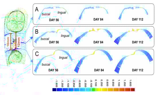 The first seven days post-extraction demonstrated the greatest dimensional changes to the alveolar ridge (Figure 2) with the mean negative maximum deviation, identified using 3D analysis, being −1.7 mm ± 0.3, when compared to day 0 (Table 1). Over the following twenty-one days and up to day 28, the mean deviation dropped to 1.3 mm ± 0.1, when compared to day 7. Finally, between day 28 and day 112, the mean deviation was 1.3 mm ± 0.2, when compared to day 28, demonstrating plateauing in the progression of ridge remodelling activity over eighty-four days. The 2D analysis (Figure 3 and Table 1) further identified that the largest deviations were present at the buccal region, especially at the midline area of the ridge (B) followed by the approximal area closest to tooth 45 (B), and to a lesser extent the area closest to tooth 47 (C).