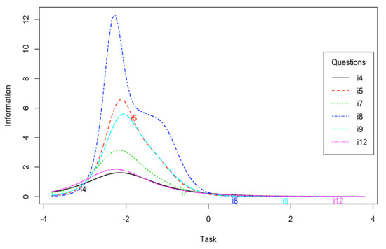 In order to analyze the reliability of individual test items, the generalized partial credit model (GPCM) scaling from Item Response Theory (IRT) was used. Information function values were given, and information curves were presented. A low information function value for a test item in the context of other values indicates lower reliability of the item due to a higher standard error. The curves show the amount of information provided for a given trait level, which is adequate to the precision of the item in the area of a given trait level. Highly confused and flat information curves show high precision of the position in the whole spectrum of item values. On the other hand, low-placed and flat curves indicate that the position provides little information in the whole spectrum of trait [28,29].