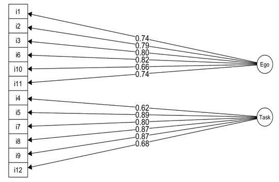 In order to determine the fitting of the theoretical two factorial model assumed by the authors (ego-6-positions/task-6 positions) to empirical data, confirmatory factor analysis was carried out. The model was estimated to comply with the theoretical assumptions without allowing for correlation between the factors. CFI, TLI and NFI values above 0.95 and RMSEA below 0.06 indicate a good fit of the model to the data [30,31]. On the other hand, values above 0.90 often indicate an acceptable fit between model and the data. Values of RMSEA below 0.08 indicate that the model fits the data sufficiently. Moreover, it is sometimes considered that RMSEA values between 0.08–0.10 indicate the mediocre fit, and values above 0.10 indicate the poor fit [32,33]. For power of the test of 0.8 and a close fit test for hypothesis: H0: ɛ0 = 0.05, H1: ɛ1 = 0.08 and df = 50, required sample size is 214, while for df = 60, required sample size is 187 [33]. Hence, it can be assumed that the sample size was sufficient.