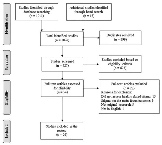 The initial search yielded 1026 studies (database search = 1011 studies; hand search = 15 studies). After removal of 299 duplicates, the titles and abstracts of the remaining 727 studies were screened using the following eligibility criteria.