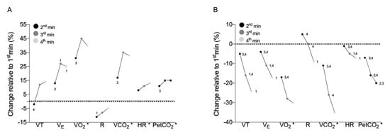Percentage of change of the cardiopulmonary variables in the 2nd, 3rd and 4th min relative to the 1st min in CPR (A) and CPR-Run (B) conditions (the horizontal dashed line represents the 1st-min mean value). 1,2,3,4 Different from the 1st, 2nd, 3rd and 4th min, respectively; * 1st-min different from all min (p < 0.05).