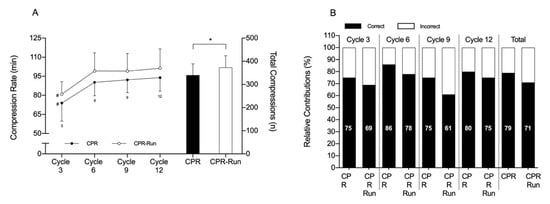 International resuscitation guidelines recommend that chest compressions should be delivered at a rate of, at least, 100 to 120 compressions/min [], with a prompt CPR delivery having an essential role in the survival chain for cardiac arrest resuscitation. In fact, a recent work has demonstrated that return of spontaneous circulation from in-hospital cardiac arrest was associated with higher chest compression rates, consistent with out-of-hospital studies of CPR quality [,]. However, in the current study, the number of compressions/min were slightly lower than that suggested (~85 and 93 compressions/min for CPR and CPR-run), which is in line with six independent studies reporting that survivors have received 85 to 100 compressions/min chest compression rates, compared with non-survivors who received a lower rate []. In the current study, the compression rate over the first three complete cycles was lower than the subsequent three CPR complete cycles for both CPR and CPR-run (~74 and 80 compressions/min), underestimating the total number of compressions assessed over the 4 min (373 vs. 340 compressions/min). In fact, the second, third and fourth three complete CPR cycles (cycle three, six, nine and 12, respectively), in both conditions, were very close to those recommend from international resuscitation guidelines [].