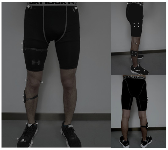 Before the motion capture data collection, participants were asked to wear the same shoes to eliminate the potential error caused by different shoes during landing. A Vicon motion capture system (Vicon Metrics Ltd., Oxford, UK) with eight cameras was used to capture the motion during the landing phase, and the sampling frequency was set at 200 Hz. According to the experimental requirements and previous data acquisition, 20 reflective markers (diameter: 12.5 mm) were attached to the participants’ lower limbs to track movement. Figure 1 shows the marker placement. The marker locations included: right and left anterior superior iliac spine, left and right posterior superior iliac spine, medial and lateral condyle, medial and lateral malleolus, first and fifth metatarsal heads, distal interphalangeal joint of the second toe. Tracking clusters were placed on the middle and lateral thigh, shank, and right heel [31].