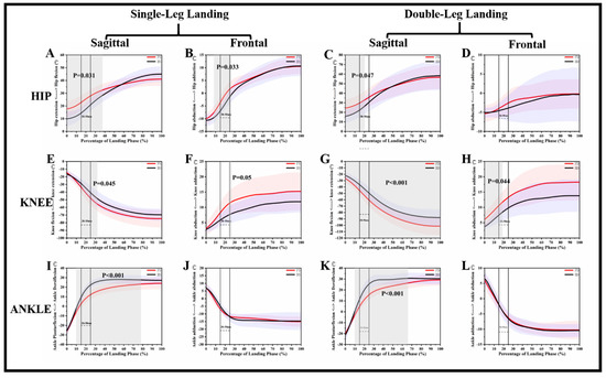 For the hip joint, Figure 2A reveals that FS depicted a greater flexion angle than BS during the 0–37.42% landing phase (p = 0.031). Figure 2C reveals that FD depicted a greater flexion angle than BD during the 0–20.66% landing phase (p = 0.047). Figure 2B reveals that FS depicted a greater adduction angle than BS during the 8.33–26.37% landing phase (p = 0.033). Table 1 shows that FS and FD depicted a greater min-flexion angle than BS (p < 0.001) and BD (p < 0.001).