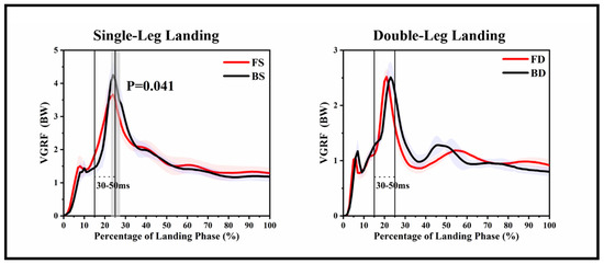 Descriptive results between forward landing and backward landing task statistical parametric mapping results, depicting the VGRF of single-leg landing and double-leg landing mean forces trajectories and standard error. The range of the two lines is the time frame between 30 and 50 ms time after landing. Gray shaded areas are statistically different (p < 0.05) between forward landing and backward landing during the landing phase. FS: forward single-leg landing; FD: forward double-leg landing; BS: backward single-leg landing; BD: backward double-leg landing.
