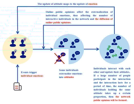 After an event triggers individuals to produce emotion, the individual maps emotion into attitude through emotional externalization, and then forms an opinion interaction with other individuals. If the proportion of individuals participating in the interaction in the network exceeds the proportion threshold P1 formed by the network public opinion, the individual attitude tends to be stable after interaction, and the proportion of individuals holding certain attitudes exceeds the proportion threshold P2 formed by the network public opinion, then the network public opinion forms. There may be more than one attitude with a proportion higher than P2, so there may be one or more attitudes in the online public opinion.