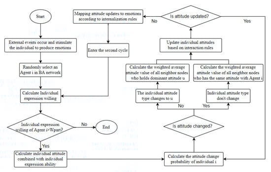 Section 3.2.1. When there is an interaction between individuals whose attitude value is not 0, their own attitudes will be updated, and the update of individual attitudes will also be synchronized with the change of individual emotions. Relevant attitudinal to emotional mapping will be introduced in