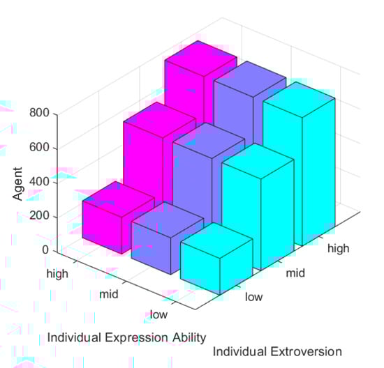 Figure 6 shows the number of people expressing their attitudes under different individuals’ extroversion and individual expression ability. It can be seen that higher individual’s extroversion represents more people carrying out emotional externalization. When the individuals in the group are in low extroversion degree, the number of externalized individuals is less than 500, the number of individuals participating in the interaction is too low, less than 50% of the total number of network people, and no network public opinion is formed. When all the individuals in the group are in a medium or high extroversion degree, the number of externalized individuals exceeds 500, and the number of individuals participating in the interaction is large, accounting for more than 50% of the total number of people on the network, and online public opinion can be formed. At the same time, the individual’s ability to express emotions was not related to the number of people engaged in emotional externalization. Therefore, the higher the degree of extroversion of netizen is, the more likely the formation of online public opinion is.