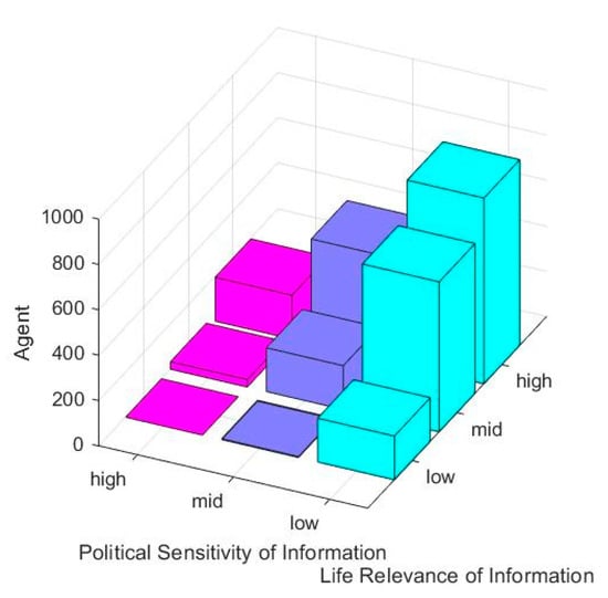 Figure 7 shows the number of agents expressing their attitudes under different factors of life relevance of information and political sensitivity of information. It can be seen that the higher the life relevance of information is, the lower the political sensitivity of information is. The more individuals carrying out externalization expression are, and the more individuals participating in interaction are, the more likely network public opinion will be formed. For example, during the period of COVID-19, the discussion of COVID-19 event was higher than that of cultural events. This is because the event is closer to people’s life and less closely related to politics, therefore, people do not feel too restrained in discussion.