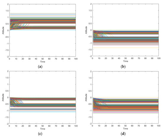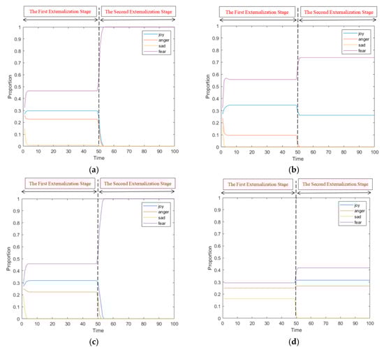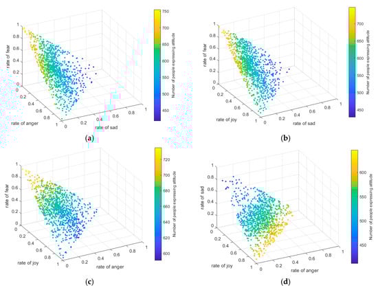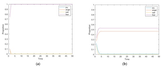 Figure 8a–d shows the situation where the proportion of joy, anger, sadness and fear is 0, and the proportion of the other three emotions is set randomly. The