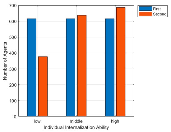 Figure 11 is a histogram of the number of nodes participating in the interaction under different internalization abilities. As can be seen from the figure, with the continuous increase of individuals’ internalization ability, the number of individuals taking part in the viewpoint interaction through the secondary expression of emotions further increases. When individuals in a group have a weak ability to internalize, online public opinion has little impact on individual emotions, and the propagation of online public opinion is inhibited. When the internalization ability of individuals in the group is in the middle or high, the situation is on the contrary, and the propagation of online public opinion is promoted.