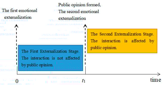 t1, network public opinion has been formed, and individuals carry out the second emotional externalization yet following interaction of views is affected by public opinion.