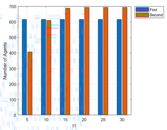 t1 = 10, the number of nodes participating in the interaction in the second emotional externalization stage was less than that in the first stage, indicating that the propagation of online public opinion was inhibited at this time. When