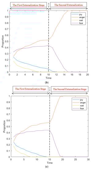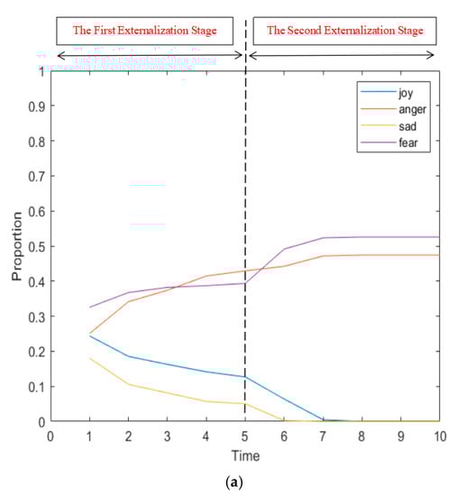 Figure 14a, in the first stage, when the interaction between individuals only took place for 5 times, although the proportion of attitudes in anger after the interaction was higher than that in fear, the proportion of the two attitudes changed with the interaction in the second stage of emotional externalization, and the attitude in fear slightly prevailed. As can be seen from