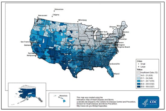 - Interactive Atlas of Heart Disease and Stroke. Interactive Atlas of Heart Disease and Stroke. Available online: https://www.cdc.gov/dhdsp/maps/atlas/index.htm (accessed on 24 October 2019).