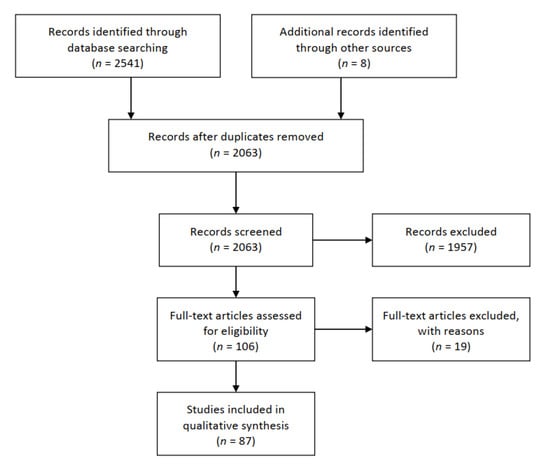 Through the electronic databases search, 2541 publications were found. After manual removal of duplicates, 2063 articles were screened. Based on title and abstract reading, 1957 studies were excluded. In total, 106 full-text articles were assessed for eligibility. Among these, 19 studies were excluded for the following reasons: uncorrected proofs (n = 16); study protocol not started yet (n = 1); commentary study (n = 1); and vade mecum for neurologists (n = 1) to help them manage patients in the COVID-19 era. Finally, 87 studies met the inclusion criteria described above and were included (Figure 1).