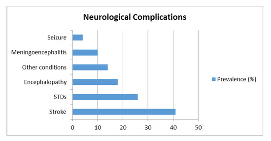 The prevalence of the main neurological complications of SARS-CoV-2 infection reported by the analyzed studies were: stroke (41%); STDs (26%); encephalopathy (18%); meningoencephalitis (10%); seizures (4%); and other conditions (14%), which included impaired consciousness, brain edema, headache, dizziness, acute mania, intracranial hypertension, EEG alterations, brain demyelination and vasculopathy.
