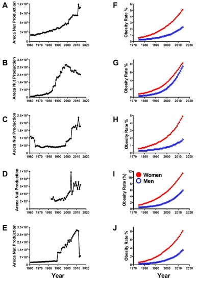 Comparisons of time-dependent increases in (A–E) areca nut production (gross production value constant 1000 1$) and (F–J) obesity rates among women (red) and men (blue) in (A,F) India, (B,G) China, (C,H) Bangladesh, (D,I) Thailand, and (E,J) Indonesia. Year over year data were extracted from the Food and Agricultural Organization of the United Nations website.