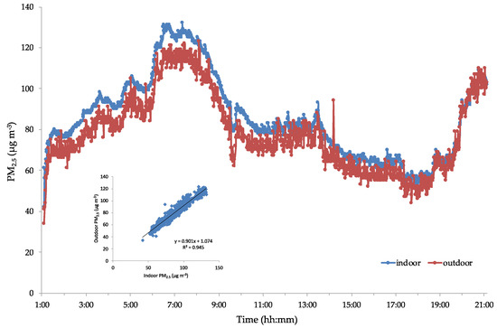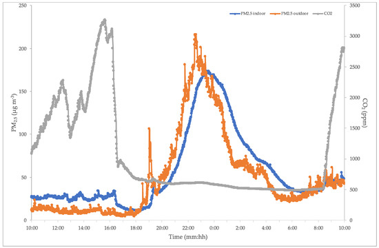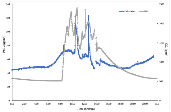 The most interesting issue is related to the occurrence after the end of school-activities. As can be seen, two different situations can be detected: from 14:00 to 17:00, indoor and outdoor PM2.5 show almost the same levels, which are quite low without relevant peaks. During this period, indoor PM is higher than outdoor, as can be expected, whereas CO2 reaches high levels (up to 3500 ppm) from 14:00 to 17:00 due to presence of students in the gyms. The authors would like to remember that the average residential indoor CO2 level is recommended to be 1000 ppm [47] but in some countries it can reach levels of 1200–1250 ppm [48,49], 1500 ppm [50], or up to 3500 ppm [51]. From 19:00 this occurrence is completely changed, the behaviors are overturned: CO2 becomes stationary, almost constant, around 500 ppm, whereas indoor/outdoor PM2.5 increases up to 230 µg m−3. What accounts for these findings? A retrospective analysis shows a close relationship between indoor and outdoor PM2.5 and low CO2 level: this suggests the presence of an event where the air exchange is really important (low CO2) and simultaneously there is high airflow from outside (similar PM values). In fact, the School White Night occurred with a large participation of people and high air remixing.