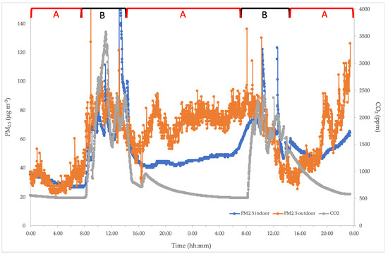 Figure 3 shows a highlight of the previous figure. It is evident that the start of activities as well as the effect of air exchange at the end of every lesson is evidenced by hourly CO2 decreases, whereas PM2.5 constantly increases its values up to an almost steady state, with some relevant peaks due to occasional events (opening windows). This typical behavior, occurring in every class when no activities are performed after the lessons, allow us to draw a baseline level of these two pollutants in any situations and estimate the risk assessment for the exposed personnel (students, teachers, administrative staff, etc.).