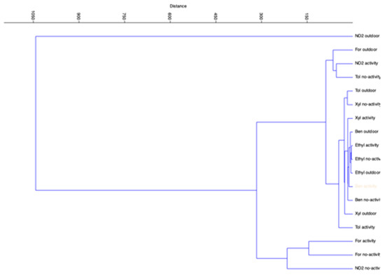 - cluster #2 is composed of three elements: formaldehyde indoor during activity, formaldehyde indoor during no-activity, NO2 indoor during no-activity;