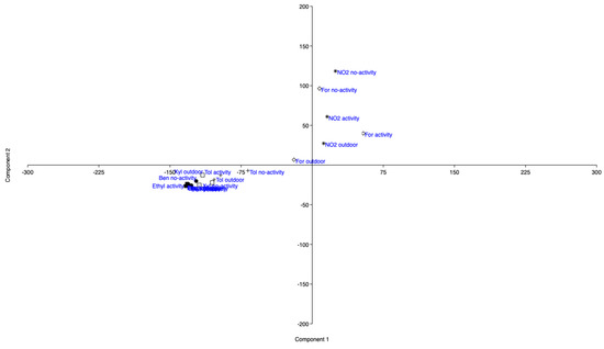 CA actually showed the presence of five clusters: for a better understanding of the representation, the authors would like to show the PCA. The first information regarding Component 1 and Component 2 is able to explain 92.3% of the overall data. In particular, Component 1 (i.e., a component formed by NO2 and formaldehyde determined indoor/outdoor) is related to compounds associated with photochemical reactions, whereas Component 2 (i.e., a component formed by toluene, benzene, ethylbenzene and xylenes determined indoor/outdoor) is related to compounds connected to combustion processes. As can be seen in Figure 6, the levels of NO2 and formaldehyde, both outdoor and during activity/no-activity, are distributed along Component 1, meaning that in such situations these compounds are predominant, whereas benzene, toluene, ethylbenzene and xylenes are relevant along Component 2, as expected.
