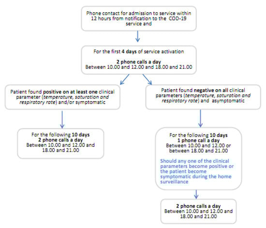 Should all the patient’s clinical parameters prove negative on four consecutive days, active home surveillance is reduced to only one phone call per day, as shown in