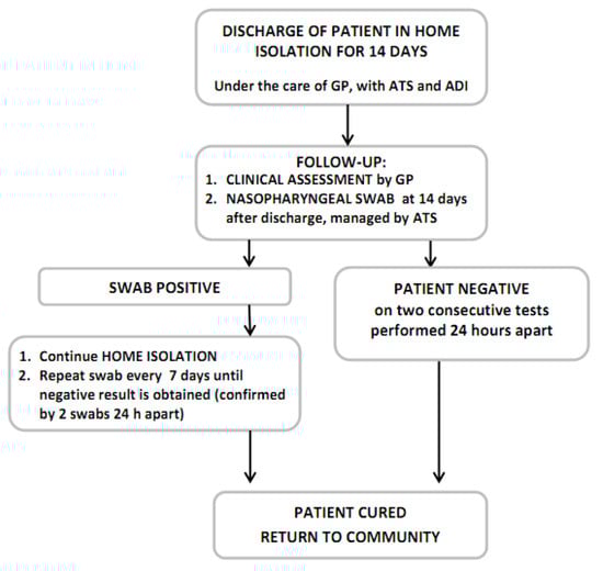 The disappearance of symptoms does not correspond to microbiological cure and the patient may still be contagious. For this reason, while at home they will have to observe a period of fiduciary quarantine, remaining in isolation and avoiding contact with other people for at least 14 days after disappearance of the symptoms. During home surveillance, the recording of values of body temperature >37.5 °C, or respiratory rate >22 breaths per minute, oxygen saturation ≤94% or a reduction in oxygen saturation of over five points following the walk test entails recalculation of the days defining clinical recovery starting from the first day on which all the above parameters are found to be negative. At the end of the 14 days of isolation, the patient undergoes two follow-up swab tests, to be taken 48 h apart, in accordance with the instructions provided by the ASST service.