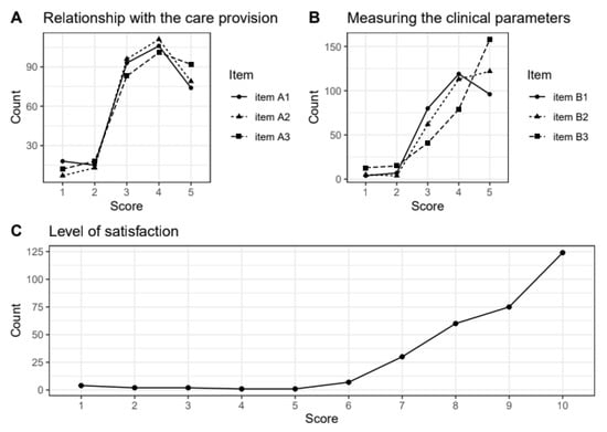 Figure 7) investigating their relationship with the care provided, ease of measurement of the clinical parameters, quality of the services used and overall satisfaction with the service, by expressing a categorical judgement (not at all, a little, somewhat, very, extremely).