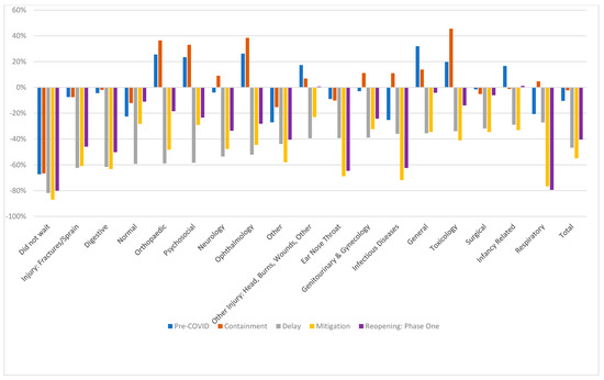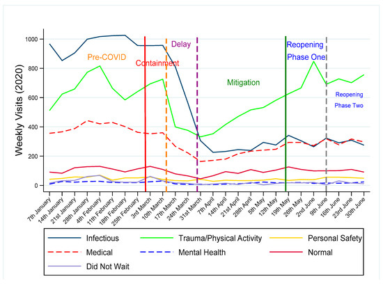 Using national health authority administration data, two studies from Ireland and Portugal show a reduction in the proportion of all patients presenting at ED across all acuity presentations [1,6]. Factors contributing to lower utilization of health services include public health emergency directed population restrictive measures (e.g., halted travel/sports and closed schools/childcare facilities) [7]. Shifts in health-seeking behaviours also contribute, with an unwillingness to access healthcare driven by concerns about contagion in hospital settings [8,9]. Evidence from SARS and MERS epidemics have shown that risk preventative behaviours, such as hospital avoidance, were widely practised, with fear of infection associated with avoidance of healthcare facilities [10,11,12,13,14]. Of concern was an increase in cases triaged ‘very urgent/immediate’ among those admitted; however, without presenting complaint or diagnosis, this finding is difficult to interpret [1,6]. Delayed presentations and restricted access to health care has worrying implications (excess morbidity and mortality), particularly for children with serious or chronic conditions or protection concerns [9,15]. Delayed diagnosis and treatment for complex chronic conditions may result in rapid deterioration in the health of a child and can have fatal consequences [9]. To the best of our knowledge no study tracks the nature of attendance by children throughout the course of the public health response to the virus.