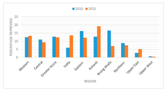 Figure 1 presents the percentage of respondents who suffered from depression (mildly, moderately and severely depressed) between 2010 and 2015 by regions. It can be observed that the Western, Volta, Ashanti and Upper East regions of Ghana recorded a rise in depression levels between 2010 and 2015. The people of the Volta region registered the highest increase in depression levels. Thus, between 2010 and 2015, depression levels in the Volta region rose by 8%, followed by Ashanti (6%), Upper East (2%) and Western (1%) region. On the other hand, the Central, Greater Accra Eastern, Northern and Upper West regions registered a decline in the percentage of depressed individuals. A significant reason for the decrease in depression levels in these regions was as a result of the basic needs model for mental health and development program, which provided services to people living with mental conditions in these areas back in 2010 [59].