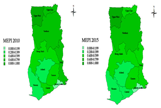 Access to electricity also witnessed improvements within the five-year period. Precisely, the proportion of households who were not connected to the grid decreased by 16%. Investments made in thermal and hydropower plants to augment the existing production is attributable to this decline [61]. Further, the telecommunication indicator witnessed a significant improvement, with about a 27% reduction in deprivation. This can be ascribed to the relative ease of transacting businesses that comes with mobile services such as mobile money transfers (MMT). This platform allows people to send, receive or store money onto their mobile devices, without requiring a bank account [62]. In Ghana, for example, this service witnessed about 216% increase in penetration as of 2015, while access to traditional banking services increased by just 2% in the same period [63].