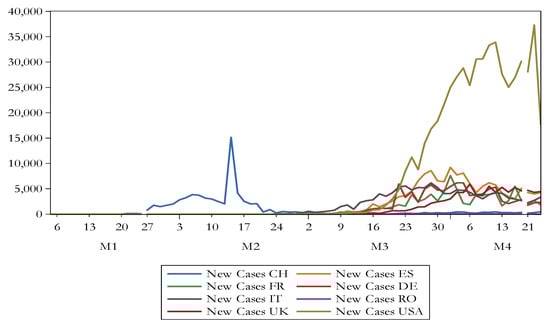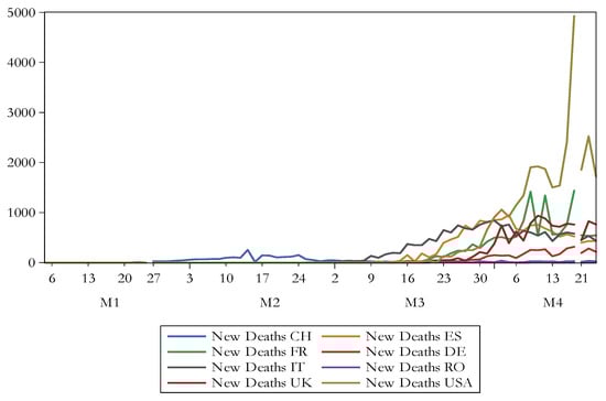 Daily stock market returns over the period 31 December 2019–20 April 2020 were collected for the following economies: United States (USA), Spain (ES), Italy (IT), France (FR), Germany (DE), United Kingdom (UK), China (CH), and Romania (RO). The selected measures are depicted in Table 1. Alike Lyócsa, et al. [], the timespan was selected since over the beginning of the corona disaster, the value of the market dropped, whereas insecurity in the market amplified severely.