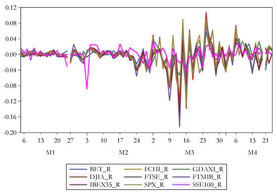 Figure 3 shows the evolution of stock market returns amongst the explored period. There is reinforced the significant volatility, especially for FTSE MIB on March 9, 2020 and March 12, 2020, as well as for Dow Jones Industrial Average on March 16, 2020. In the first two months of 2020, DAX declined by 10.2 percent, CAC 40 dropped by 11.2 percent, whereas FTSE 100 plunged 12.7%. In the same vein, Dow Jones throw down by 11 percent and S&P 500 by 8.6 percent. The Bucharest Stock Exchange also encountered instabilities and registered a decay of 8.6 percent []. Capelle–Blancard and Desroziers [] contended that prior to February 21, stock markets disregarded the pandemic, but over February 23–March 20, the reaction to the rising number of diseased people was strong. As such, Mazur, Dang and Vega [] emphasized that the failure of stock quotes in March 2020 marked one of the major financial market collapses in history. Baiardi, et al. [] developed a three-regime switching model and concluded that in 2020 the most common state for the Dow Jones Industrial Average was turbulent.
