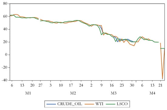 On the contrary, there was proved that everyday cases of new contagions have a low adverse effect on the crude oil quotations in the long-term []. Albulescu [] explored whether the COVID-19 and crude oil influence the economic policy uncertainty of the United States and observed no impact when considering the global coronavirus data, but a positive effect when assessing the condition outside China. Sharif, et al. [] established a unique responsiveness of stock market of USA, related economic policy uncertainty, and geopolitical risk to the joint shocks of the coronavirus and oil instability. For the case of Colombia, Cardona-Arenas and Serna-Gómez [] argued that the depreciation of national currency against the dollar commenced after the diagnosis of the initial positive coronavirus case which determined a rise in global oil value.