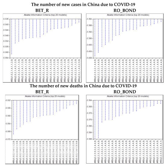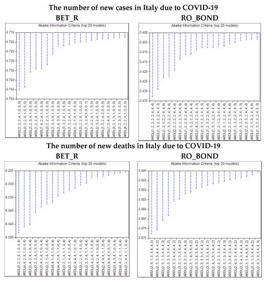 Figure 7 shows the results of criteria graph for the ARDL model that takes into account the number of new cases and new deaths in Italy, both for the BET stock index return and for the Romanian Government bond (10Y). Likewise, in case of Italy, in total, 1,562,500 ARDL model specifications were considered for each of the four cases.